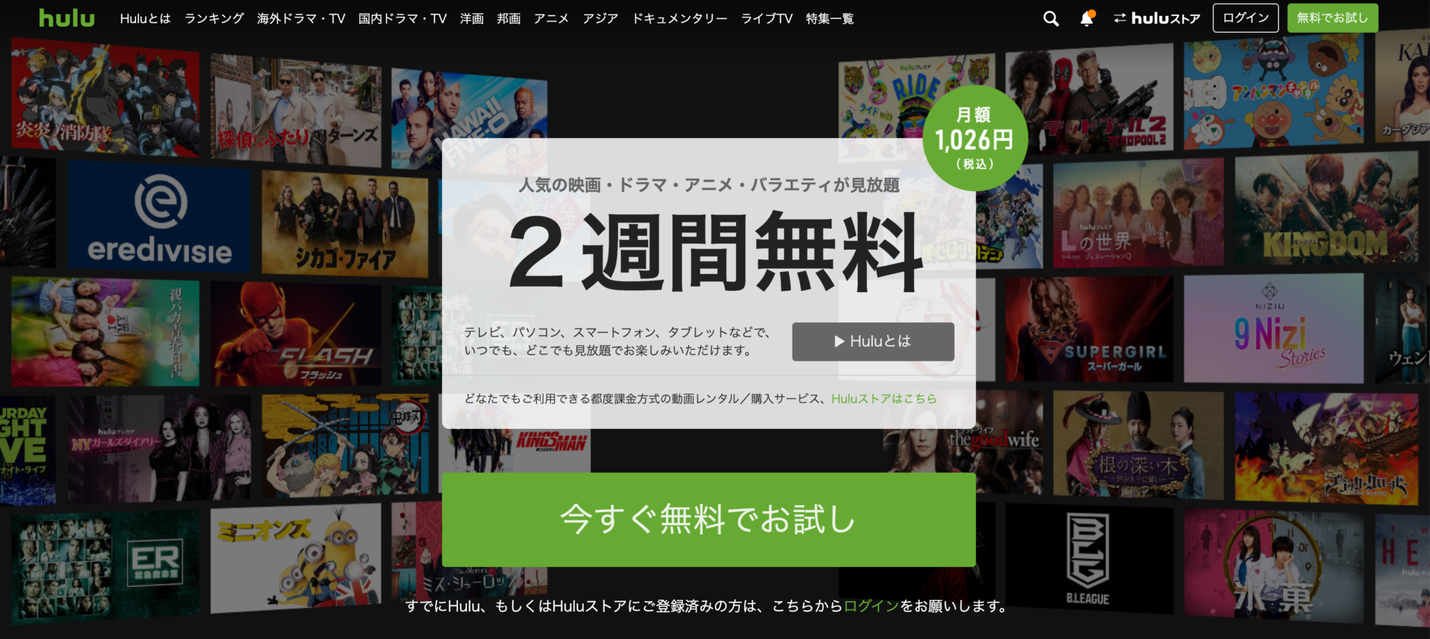 Huluは本来月額料金が発生する動画配信サービスですが、2週間の無料お試し期間があります。