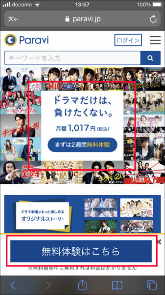Paravi公式サイトのトップに表示される「ドラマだけは負けたくない」、もしくは下の「無料体験はこちら」をタップします。