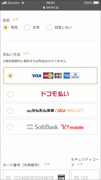 ここで、支払い方法を入力しても、2週間のお試し期間内に解約すれば料金は発生しませんのでご安心ください。