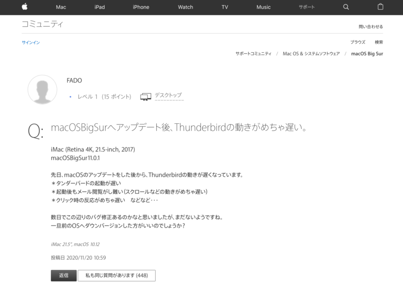2020年11月にリリースされた新しいMacOS「Big Sur」をインストールしたら、メールソフト「Thunderbird(サンダーバード)」が遅くなってしまい、使い物にならなくなりました。